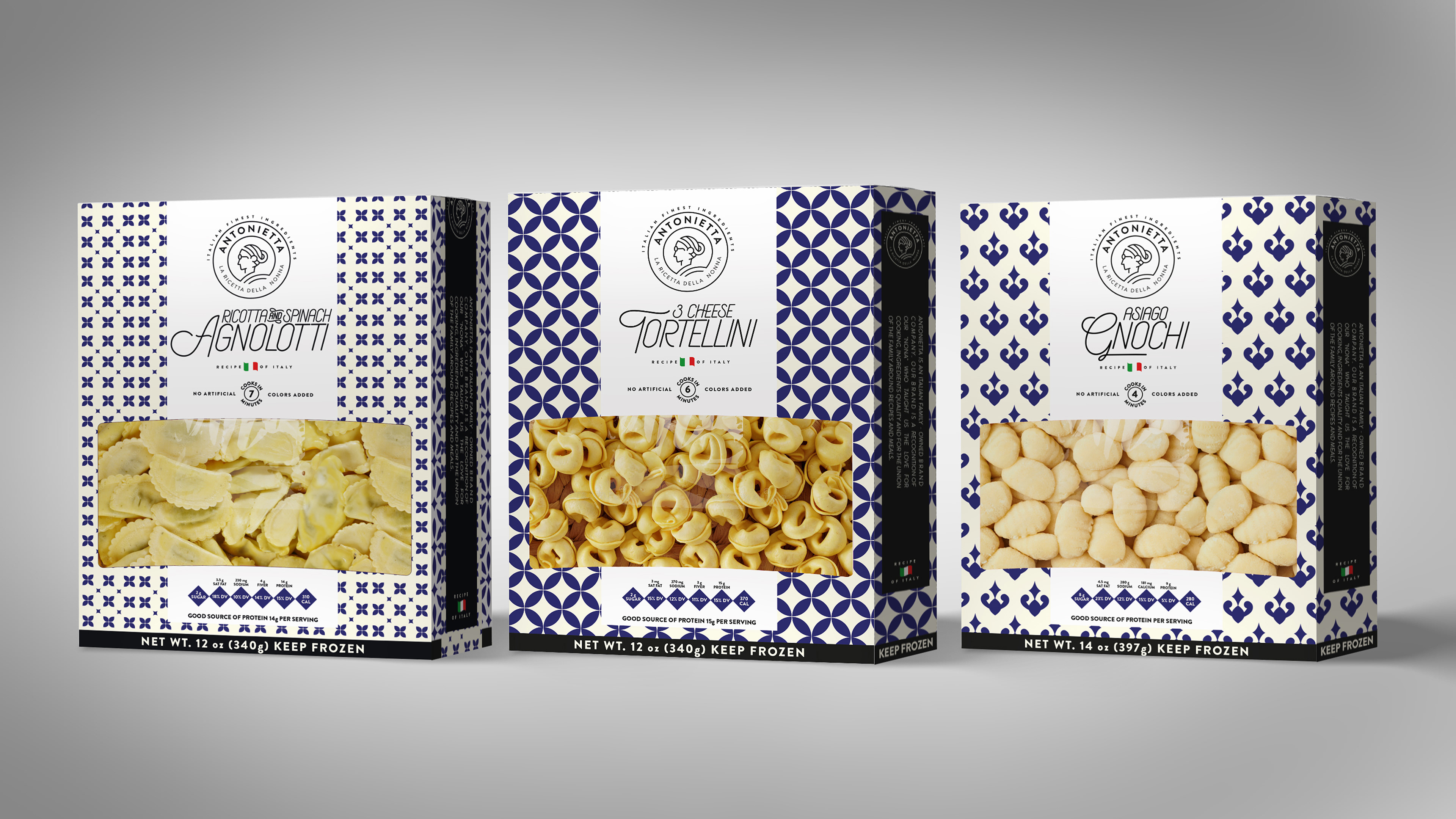 Diseño de empaques para Pasta seca y Pasta congelada Antonietta. Una marca de Alimentos frescos y congelados italianos. Miami, Estados Unidos. 2022